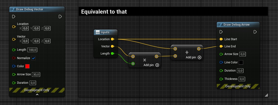 Draw Debug Vectornode: This node is a shortcut to avoid doing manual calculation each time you want to draw a debug vector. This is basically the same as aDraw Debug Arrowwith theLocationasLine Startand theLocation + Vector * LengthasLine End.